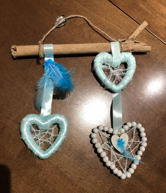 2 cœurs entourés de ruban de satin bleu clair, agrémentés de plumes assorties, le 3ème est entouré de perles bleues-grises.
